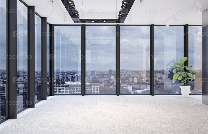 Пустая комната с панорамными окнами и видом на город. 3D-рендеринг