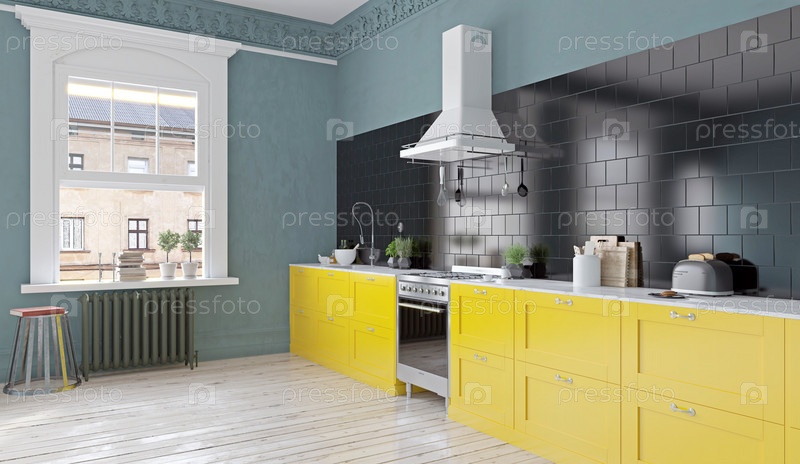 Современная кухня с желтыми шкафами и черным фартуком