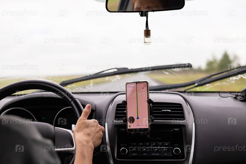 Вид сзади на молодого путешественника, использующего навигатор на мобильном телефоне за рулем современного автомобиля