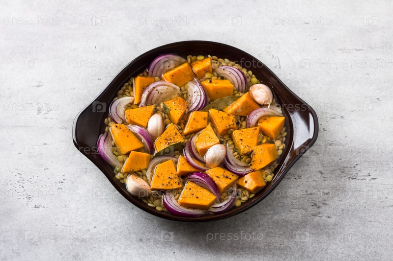 Чечевица с тыквой, красным луком, чесноком и специями, залитая бульоном перед запеканием на сером текстурированном столе, вид сверху. Готовим вкусную здоровую веганскую еду