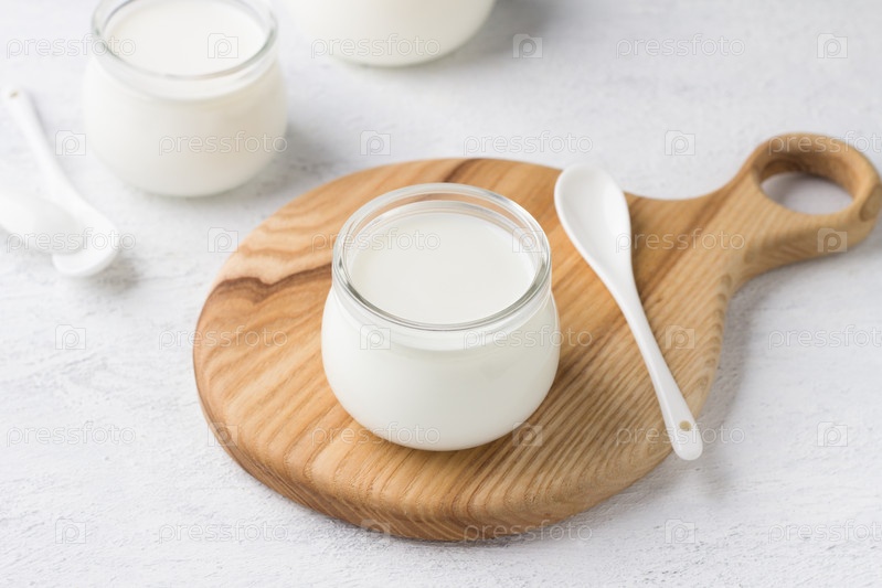 Натуральный домашний йогурт в стеклянной банке на деревянной доске на светло-сером фоне