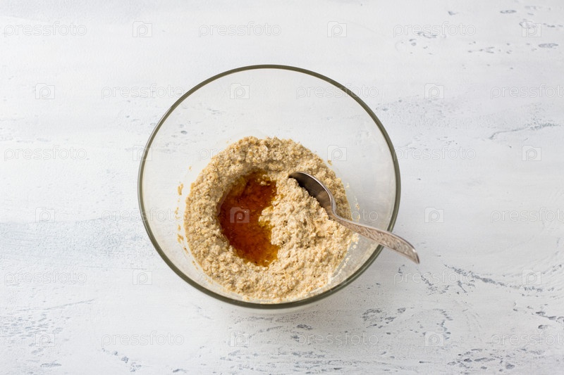 Стеклянная миска с замоченной овсянкой и медом на светло-голубом столе, вид сверху. Готовим вкусный полезный веганский десерт или другое блюдо