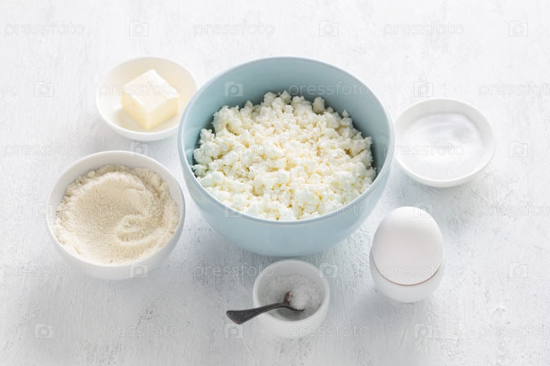 Ингредиенты для кето-чизкейков: творог, кокосовая мука, яйцо, масло, подсластитель эритрит и соль на светло-сером фоне. Готовим вкусную здоровую пищу