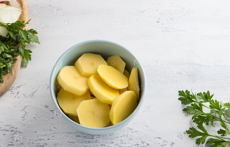 Миска с нарезанным картофелем, петрушкой и рубленым луком на светло-сером фоне, вид сверху. Готовим вкусную домашнюю еду