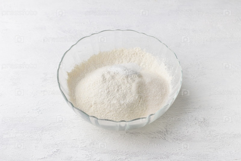 Стеклянная миска с просеянной мукой, сахаром и разрыхлителем на светло-сером фоне. Готовим вкусную домашнюю выпечку шаг за шагом