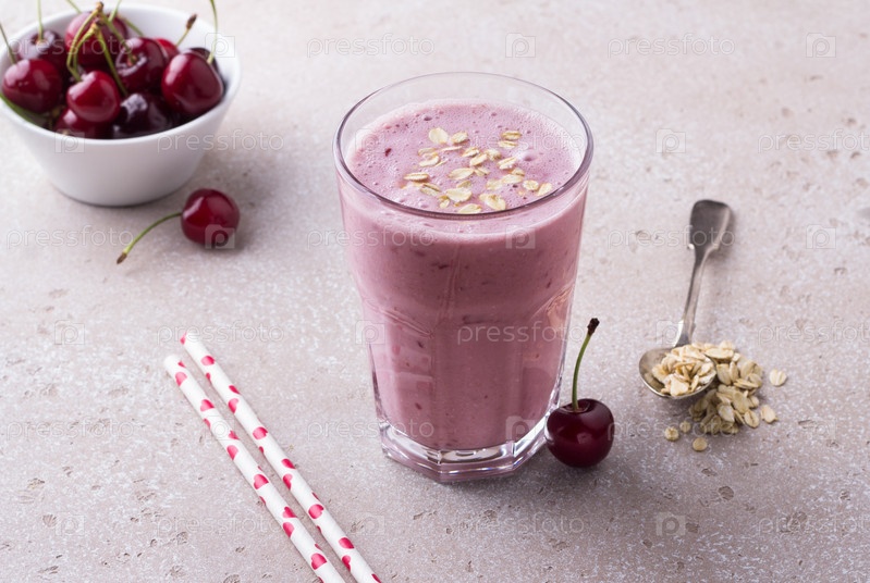 Молочный коктейль с вишней, йогуртом и овсянкой, соломинки для питья, миска со свежей вишней на бежевом фактурном фоне