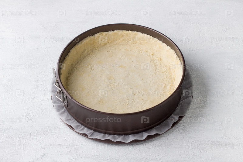 Приготовление чизкейка, металлическая разъемная форма для выпечки с песочным тестом для чизкейка или другого пирога. Пошаговый этап приготовления, домашняя выпечка, светло-серый фон