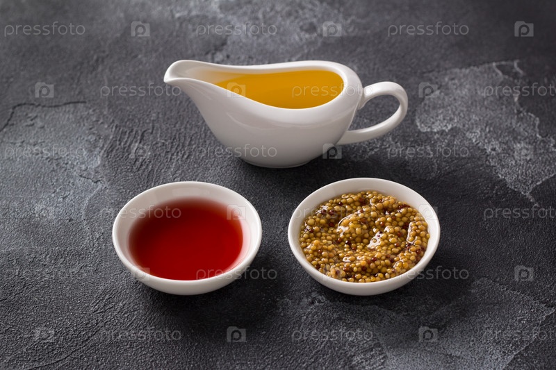 Винный уксус, зерновая горчица, растительное масло на темном текстурированном фоне. Соус Винегрет Ингредиенты
