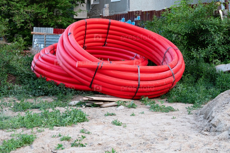 Вид сверху на большие блестящие черные канализационные трубы, сложенные на строительной площадке с оранжево-красным защитным ограждением