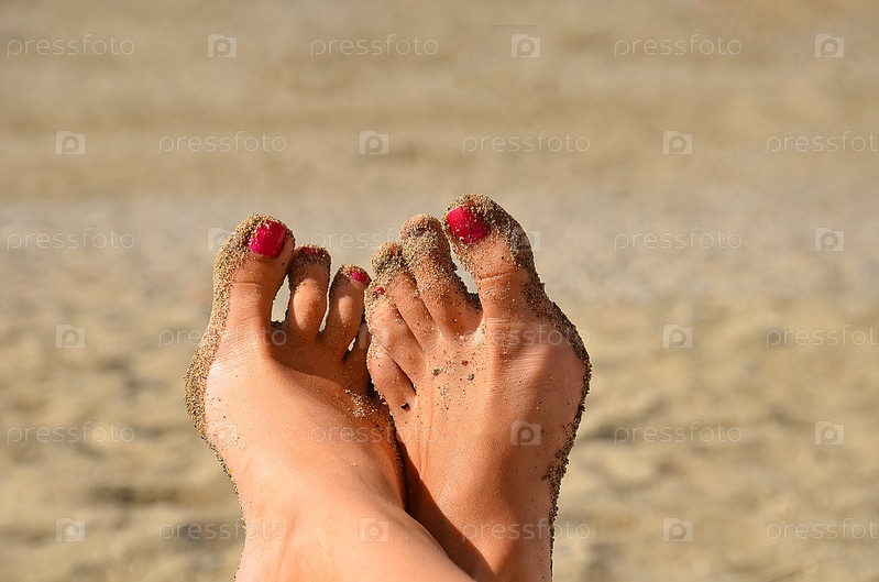 Изящные женские ноги крупным планом на песчаном пляже. Концепция летних каникул