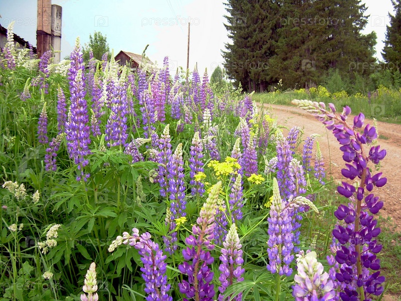 Цветут люпины дикорастущие вдоль сельской деревенской дороги
