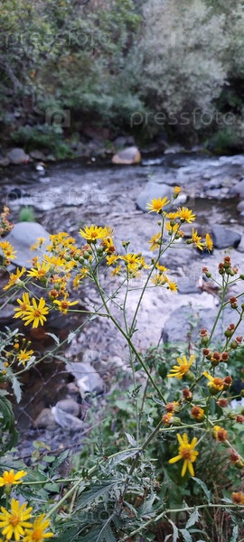 Жёлтые полевые цветы у горной реки в горах летом