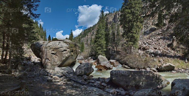Кыргызстан, восточный берег озера Иссык-Куль. Вид на скальные нагромождения в долине реки Арашан с редкими одинокими елями среди заросших гор