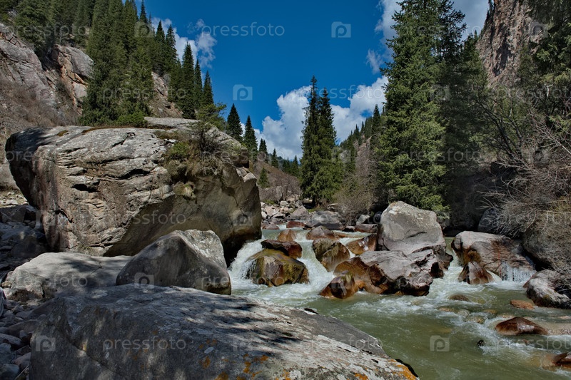 Кыргызстан, восточный берег озера Иссык-Куль. Вид на скальные нагромождения в долине реки Арашан с редкими одинокими елями среди заросших гор