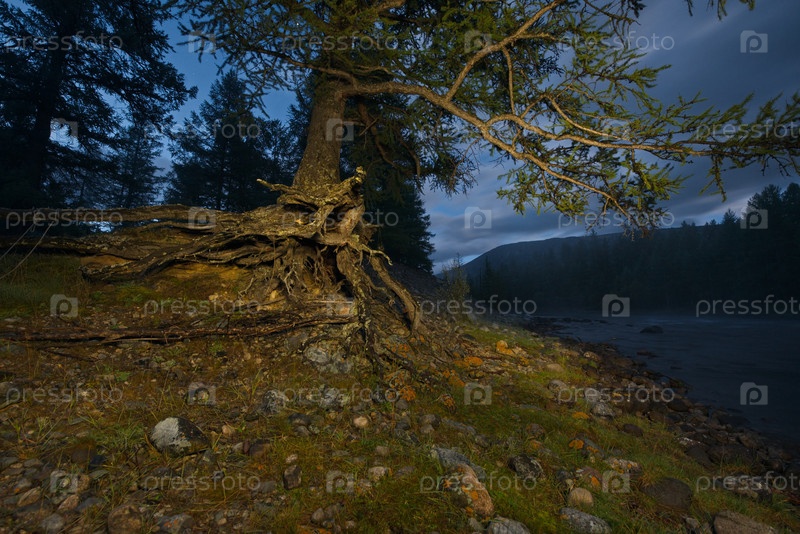 Россия, Западная Бурятия. Причудливые корни огромной лиственницы подмытые весенними водами реки Тисса, притока реки Саянская Ока