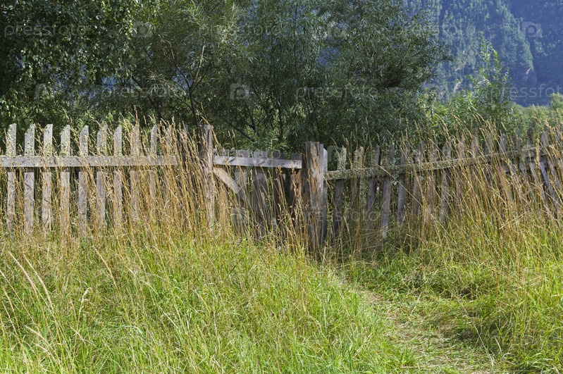 Старый покосившийся деревянный забор. Лето, август