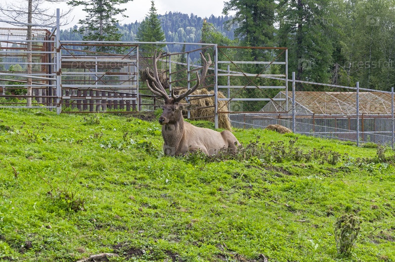 Самец алтайского марала в вольере в зоопарке. "Таежный зоопаррк" в селе Артыбаш на берегу Телецкого озера, Россия. Август