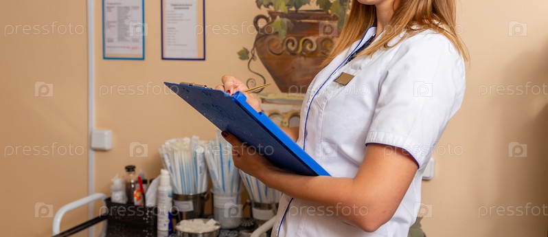 Медицинский работник с планшетом в руках готовится оказать помощь пациенту в хорошо оборудованном медицинском учреждении