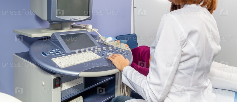Врач проводит ультразвуковую диагностику брюшной полости беременной девушки на раннем сроке беременности