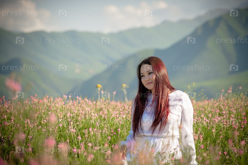 Азиатская девушка в цветочном поле в белом платье на природе на фоне гор