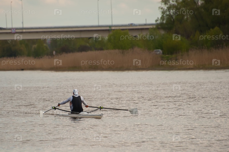 Спортсмен на лодке тренируется гребле на реке в Калининграде