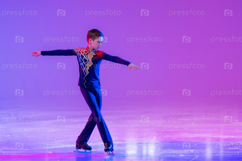Мальчик-фигурист катается на льду. С праздничной сиреневой подсветкой