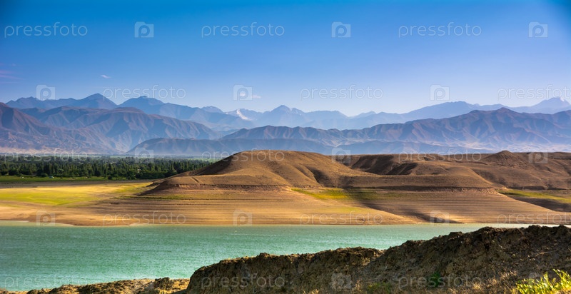 Горное озеро во время заката на фоне хребтов