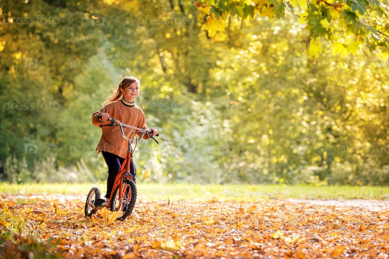 Красивая школьница катается на самокате в осеннем парке в солнечный день
