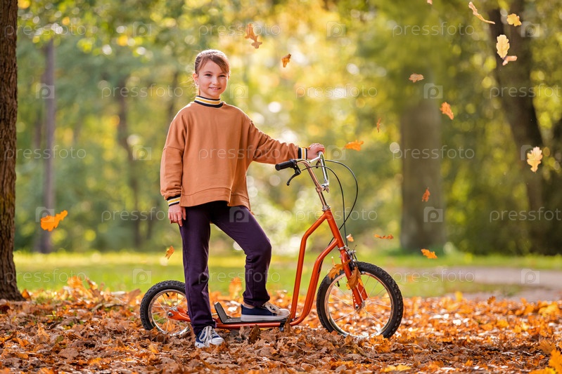 Красивая школьница катается на самокате в осеннем парке в солнечный день