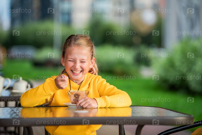 Школьница сидит за столиком в городском летнем кафе. Она пьет кофе и чай со сладостями