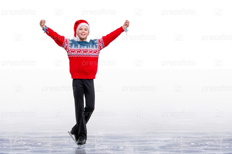 Мальчик-фигурист в шапке Санта-Клауса катается на льду, изолированном на белом фоне. Зимние виды спорта для детей. Рождественская открытка с местом для копирования