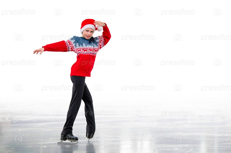 Мальчик-фигурист в шапке Санта-Клауса катается на льду, изолированном на белом фоне. Зимние виды спорта для детей. Рождественская открытка с местом для копирования