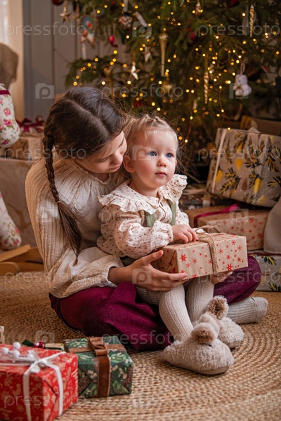 Две сестры сидят рядом с елкой и подарками в интерьере загородного дома. Теплая уютная атмосфера в винтажном стиле кантри