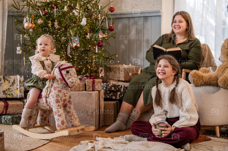 Семья с детьми отдыхает вместе в интерьере загородного дома на фоне новогодней елки