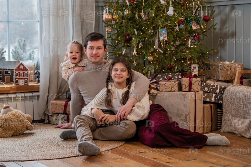 Семья с детьми отдыхает вместе в интерьере загородного дома на фоне новогодней елки