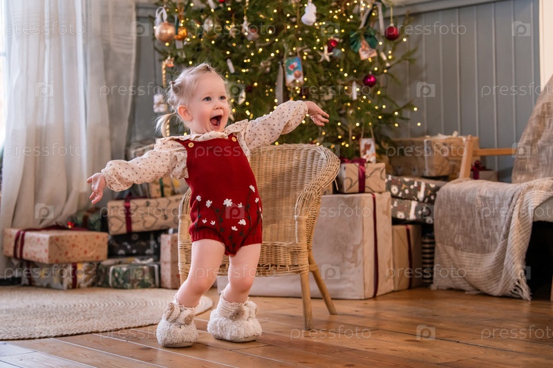 Маленькая девочка радуется в предвкушении подарков на фоне елки в интерьере загородного дома. Теплая уютная атмосфера в винтажном деревенском стиле
