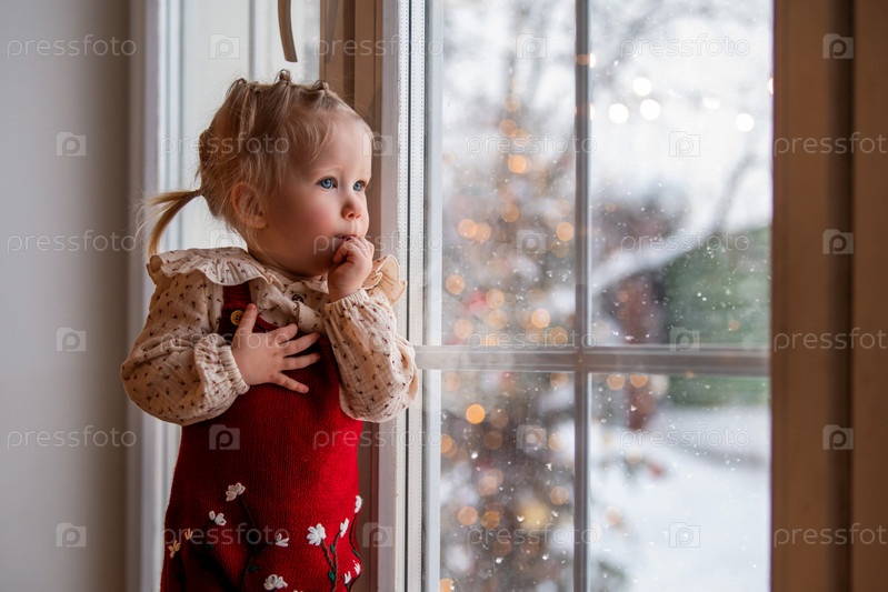 Маленькая девочка смотрит в окно на рождественскую елку, огни и падающий снег