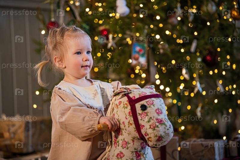 Маленькая девочка сидит на качалке на фоне рождественской елки в интерьере загородного дома. Теплая уютная атмосфера в винтажном деревенском стиле