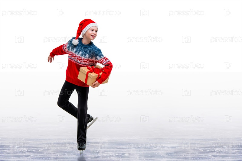 Мальчик-фигурист в шапке Санта-Клауса катается на льду, изолированном на белом фоне. Зимние виды спорта для детей. Рождественская открытка с местом для копирования