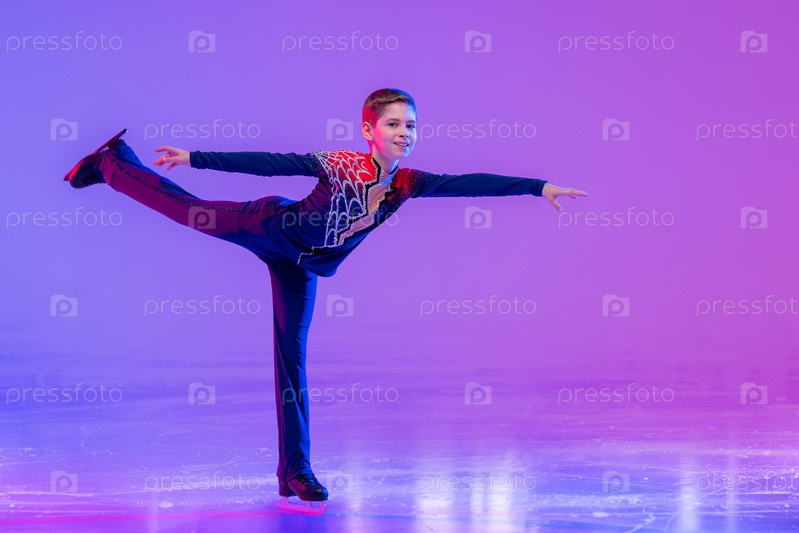 Мальчик-фигурист катается на льду. С праздничной сиреневой подсветкой