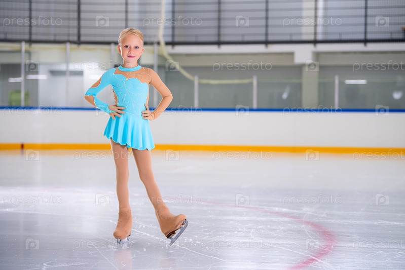Портрет маленькой девочки в полный рост, занимающейся фигурным катанием на крытом катке во время выступления, место для копирования