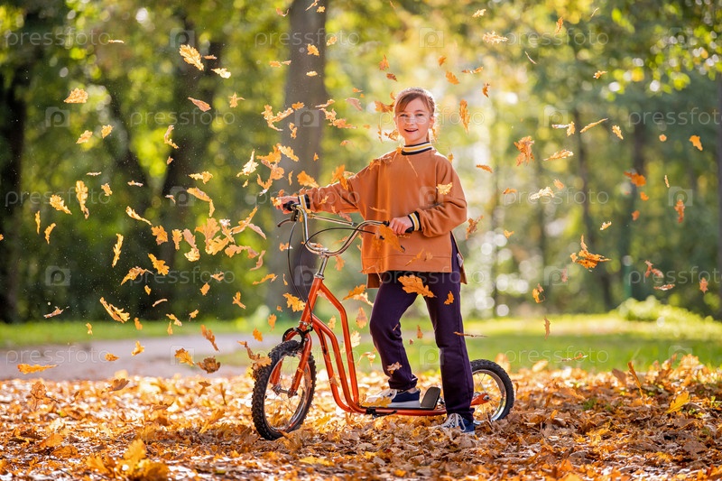 Красивая школьница катается на самокате в осеннем парке в солнечный день