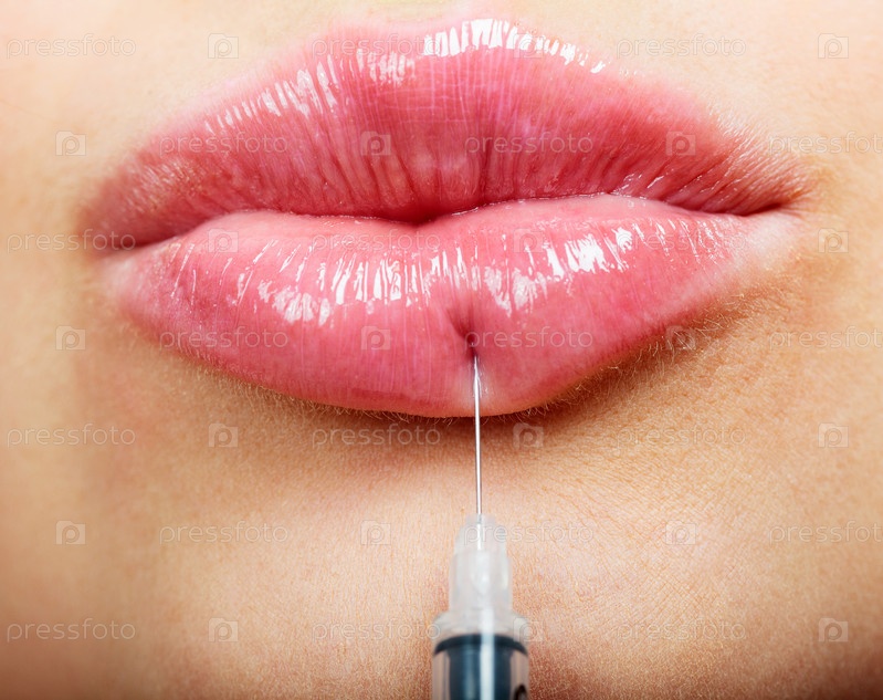 Крупным планом снимок красивых женских губ и шприца с наполнителем