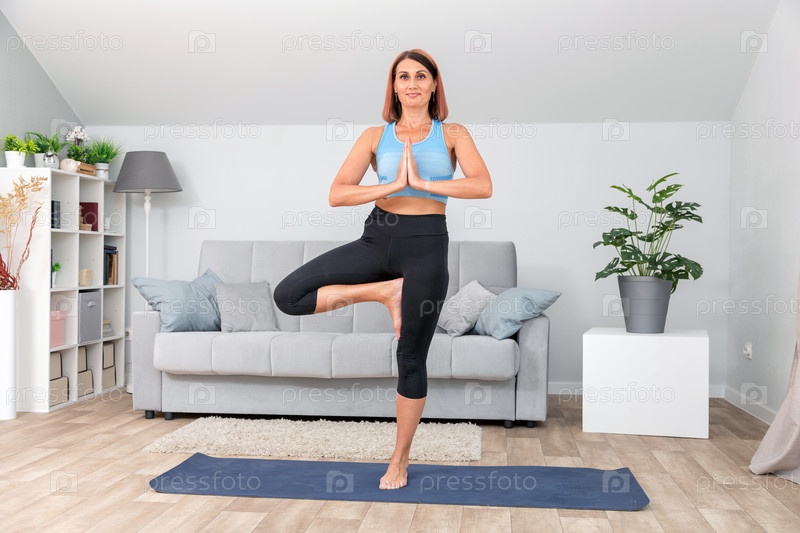 Вид спереди на стройную женщину среднего возраста, занимающуюся йогой дома в гостиной. Дама стоит на одной ноге