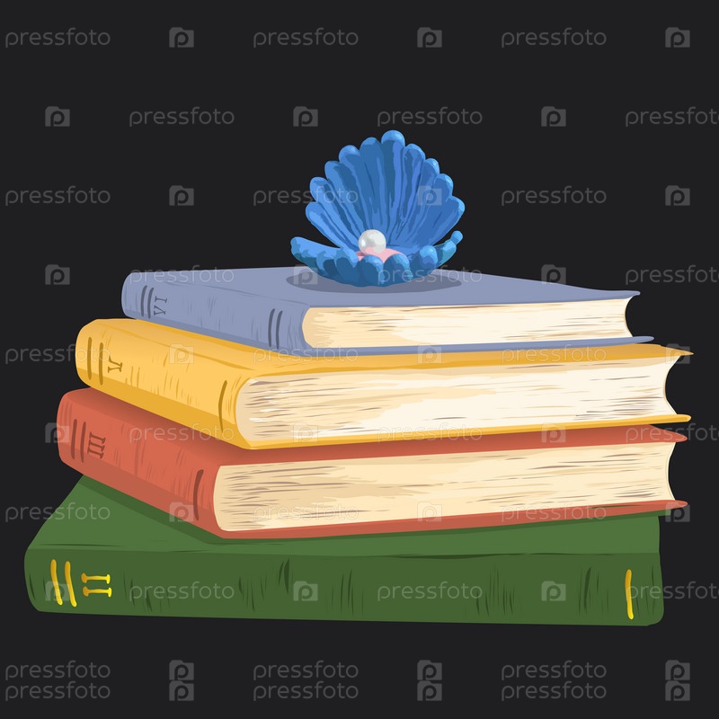Стопка разноцветных книг с маленькой ракушкой наверху. В открытой ракушке лежит белая жемчужина