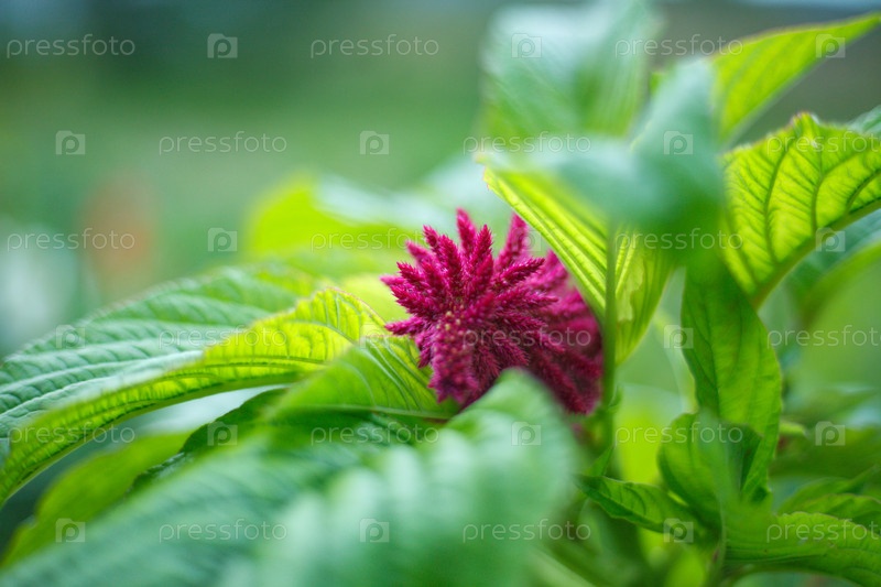 Яркий фон с зеленой листвой и бордовым цветком аморанта в центре. Красивые летние садовые фоны с цветами и растениями макрофотография