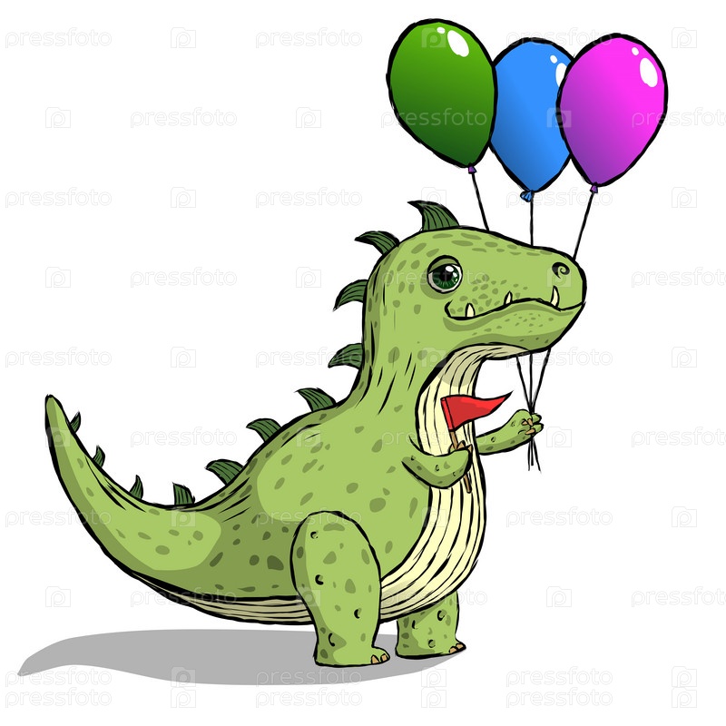 Забавный динозавр с воздушными шарами и флажком для поздравлений