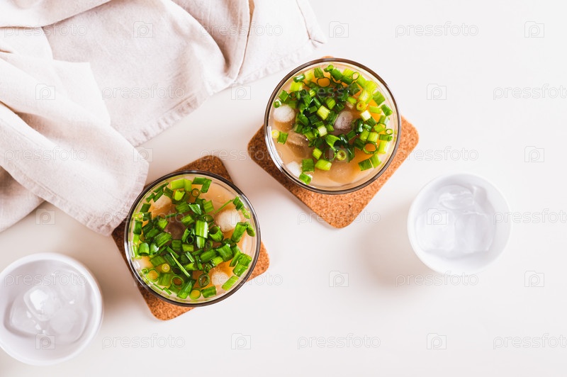 Весенний ледяной латте с зеленым луком в стаканах на столешнице