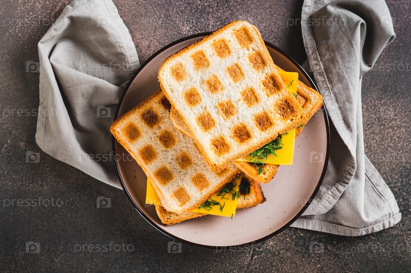 Крупный план сэндвича из вафельных тостов с плавленым сыром и зеленью на тарелке, вид сверху