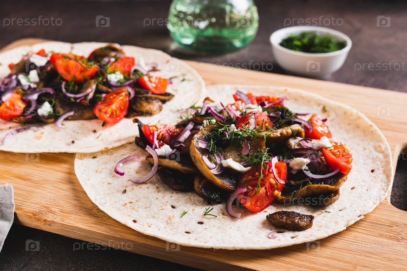 Вкусные тако с жареными грибами, помидорами, луком и фетой на доске